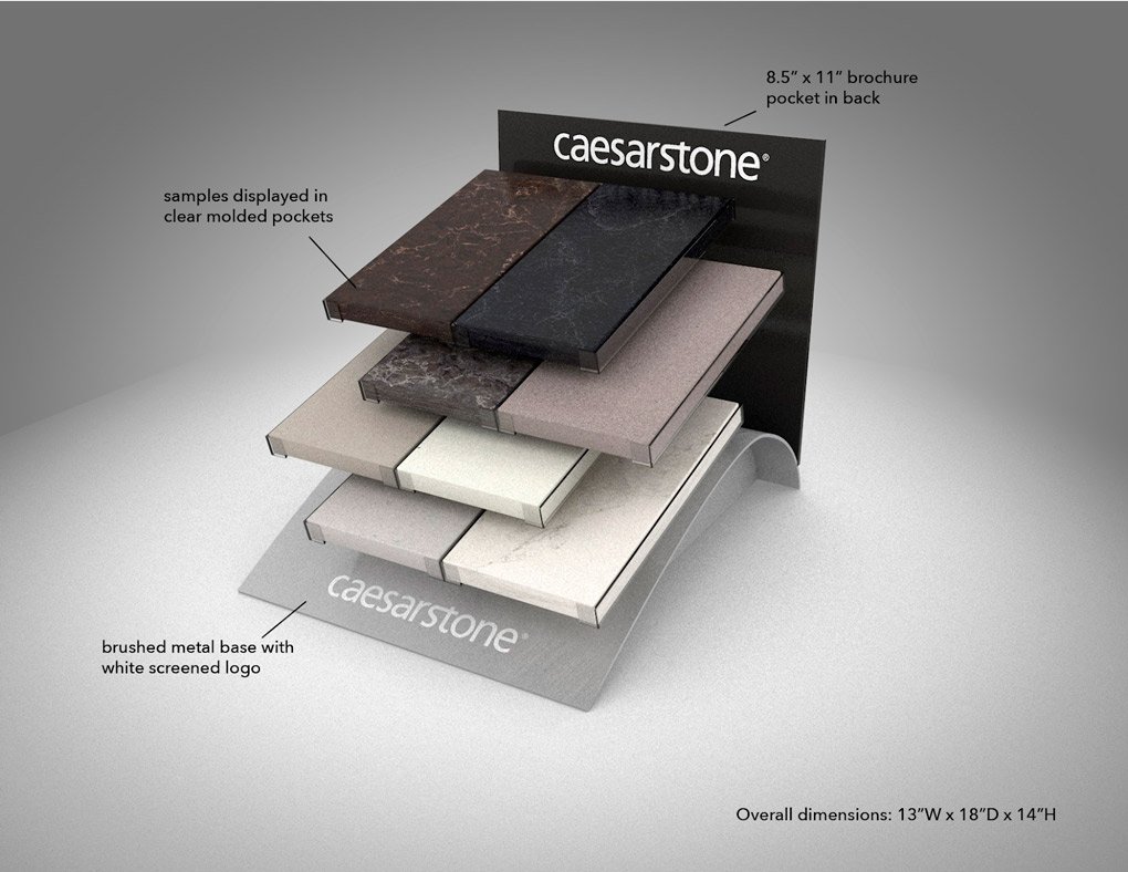 No space for a floor rack? A countertop display is a great alternative. We designed this clear shelf display for Caeserstone so the customer’s attention can focus on the samples instead of the shelving. The stone is mounted in such a way that the customer can see the colours on the edge, and the curved sheet metal base with the logo makes for an appealing foundation.