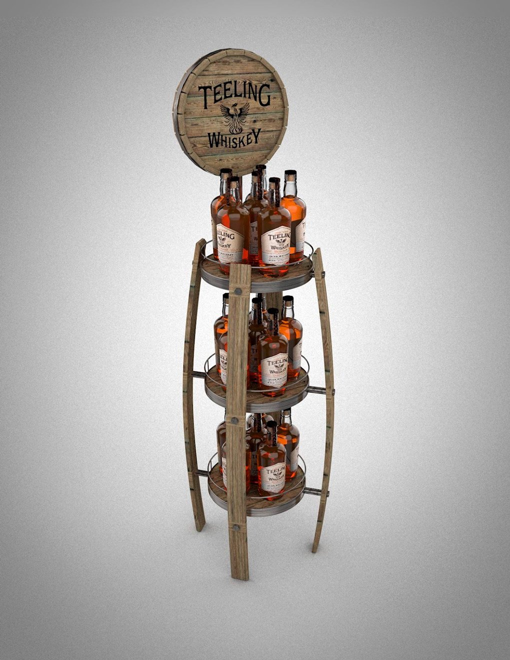 Everything from texture to color intentionally enhances the Teeling Whisky brand. The wood and metal mixture makes for easy assembly, and we were able to create the look of a simple barrel to give the best visual impact for the product.
