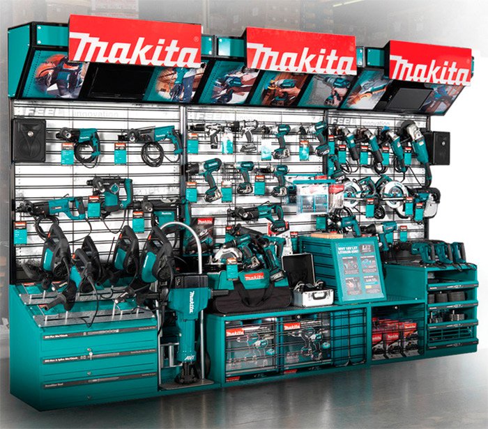 First, this display is an interactive touch and feel display. There are video screens at the top left and right, and Kicker speakers on each side (Makita partnered with Kicker speakers for this display). The Makita logos are lit up. Originally, Makita had 22 wire tool holders to hold all the types of tools they wanted to include in their display, but in the final version we simplified that to 6 holders. Overall, it was an intensive process to design and engineer this POP display, but the end result was worth it!
