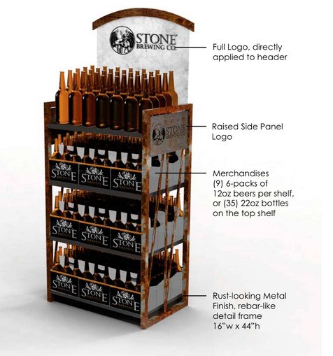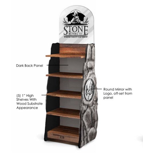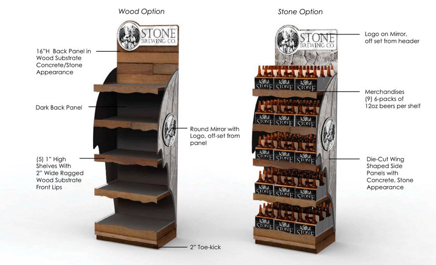 For this display, the Stone Brewery logo gave us lots of options to make their display pop. We drew inspiration from dark and light wood tones, stone detailing, mirrored headers and rustic-looking distressed metal. You want your POP display to be instantly recognizable as your brand as well.