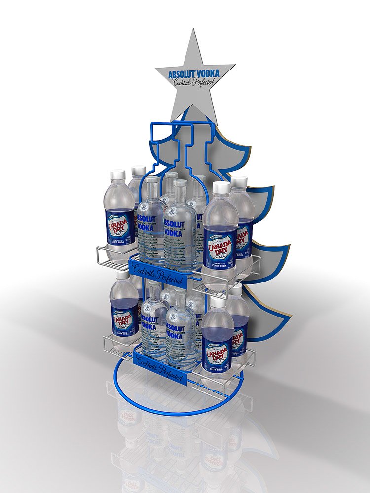 By using an MDF board in the back of this display, in the shape of a tree, we incorporated the branding of the product with the Christmas theme. The MDF is then attached to a wire frame and shelves which hold the vodka and the mixer. This is a bit on the larger side for a counter display, but it works very well to bring in the season and draw attention to the product at the same time.