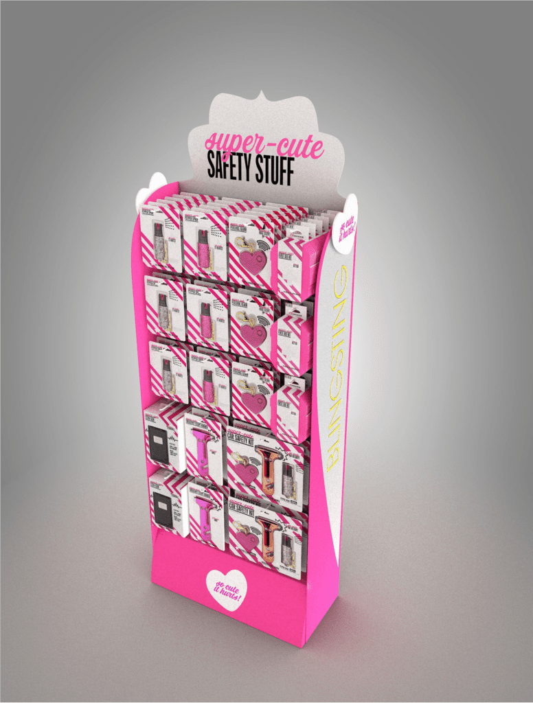 This corrugate display is bright pink, as it is tailored towards female consumers. It features plastic hooks to hold carded products.