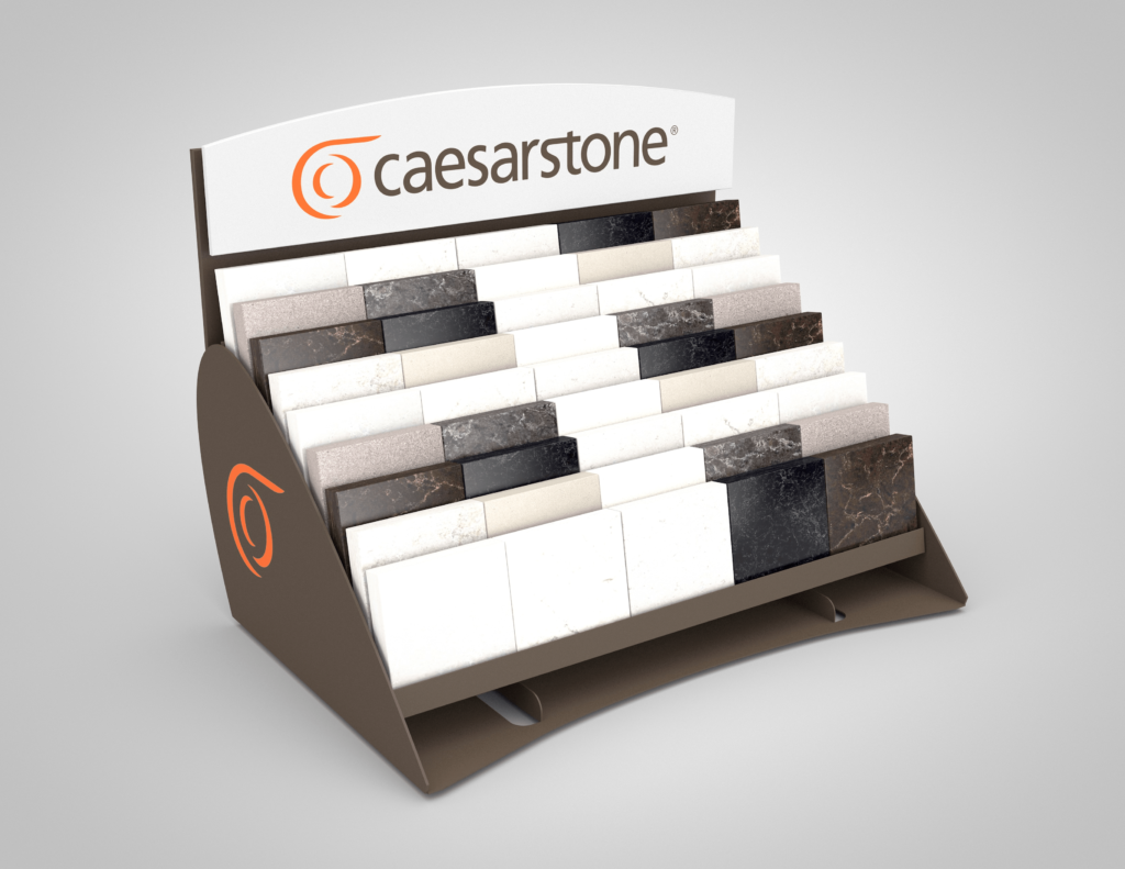 A simple metal counter display with the company’s logo on the side panels.