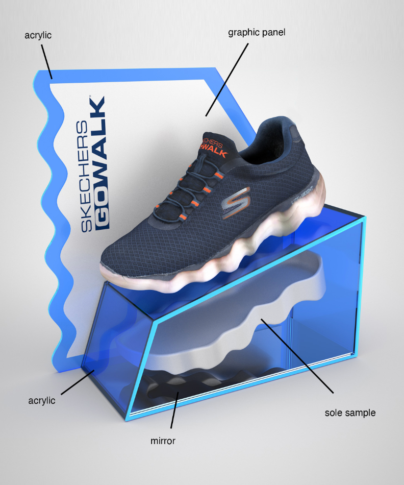 A plastic single-shoe display with translucent, white, and blue lit edge plastic.